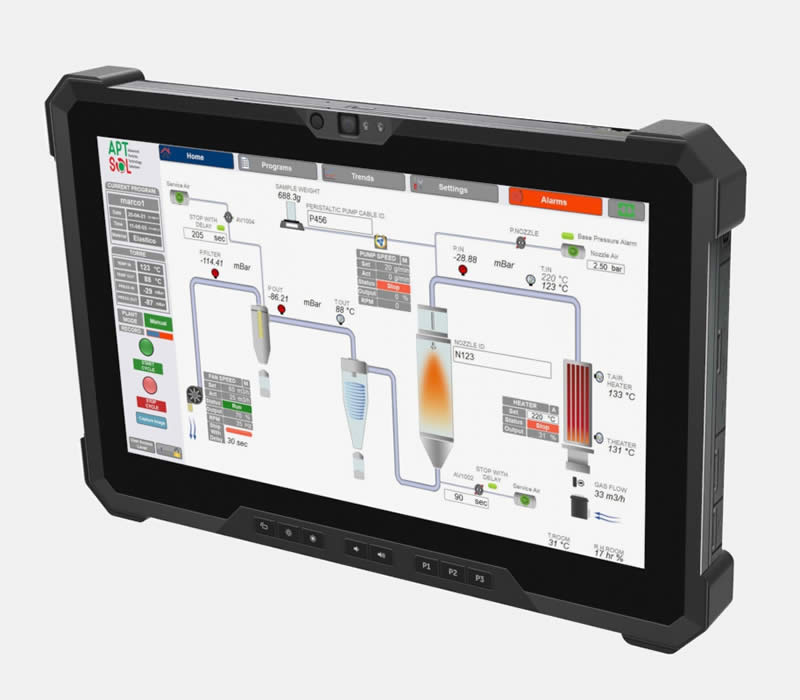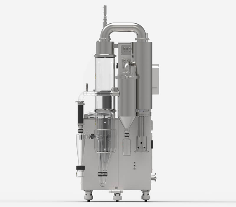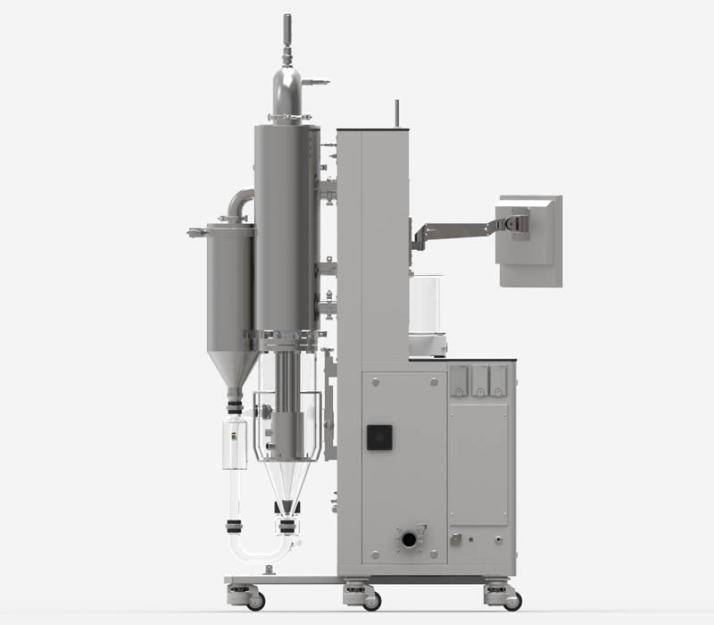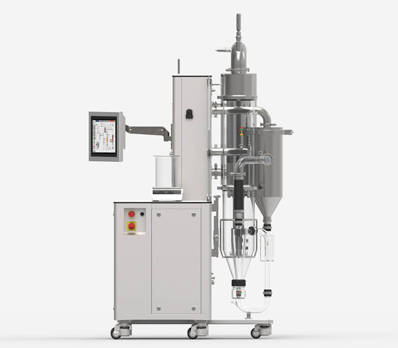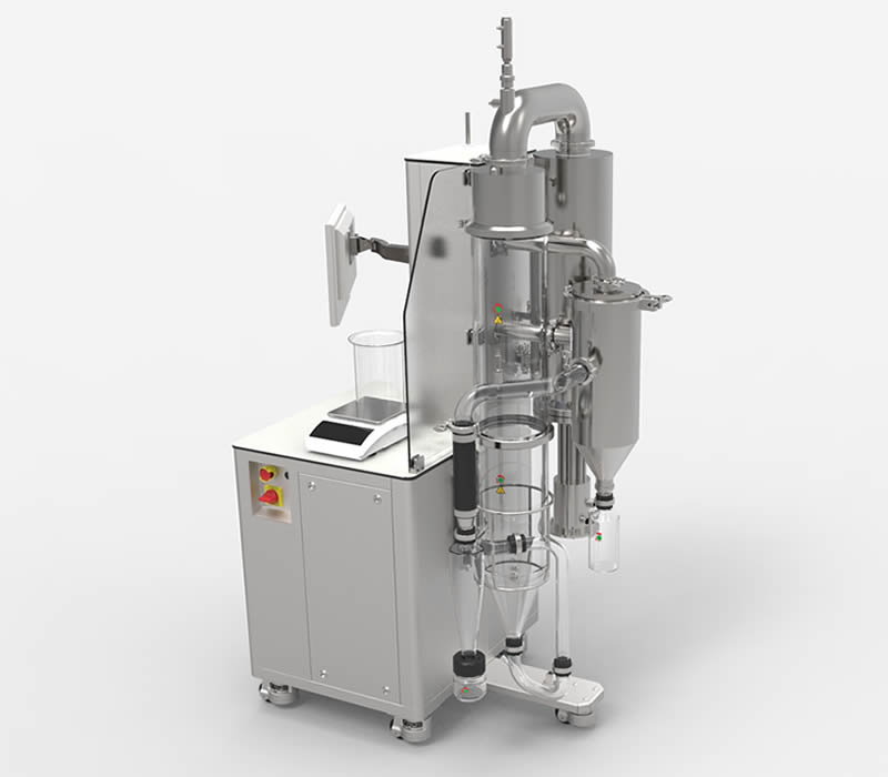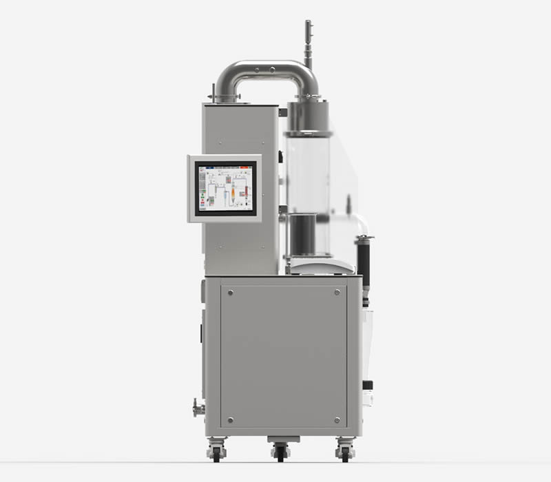 Controllo completo del processo da un comodo tablet touch screen industriale per il controllo remoto (eccellente per inserire l’apparecchiatura in aree ad alto contenimento). Completamente personalizzabile: la colonna di essiccamento, i cicloni e i porta filtro sono disponibili sia in vetro che acciaio. Il filtro a maniche è dotato di un secondo scarico consentendo anche la raccolta delle polveri più sottili. L’apparecchiatura è dotata di ruote pivotanti per una facile allocazione anche in piccoli laboratori. L’adozione di un ampio piano di lavoro supera, in termini di praticità, qualsiasi spray dryer da banco.